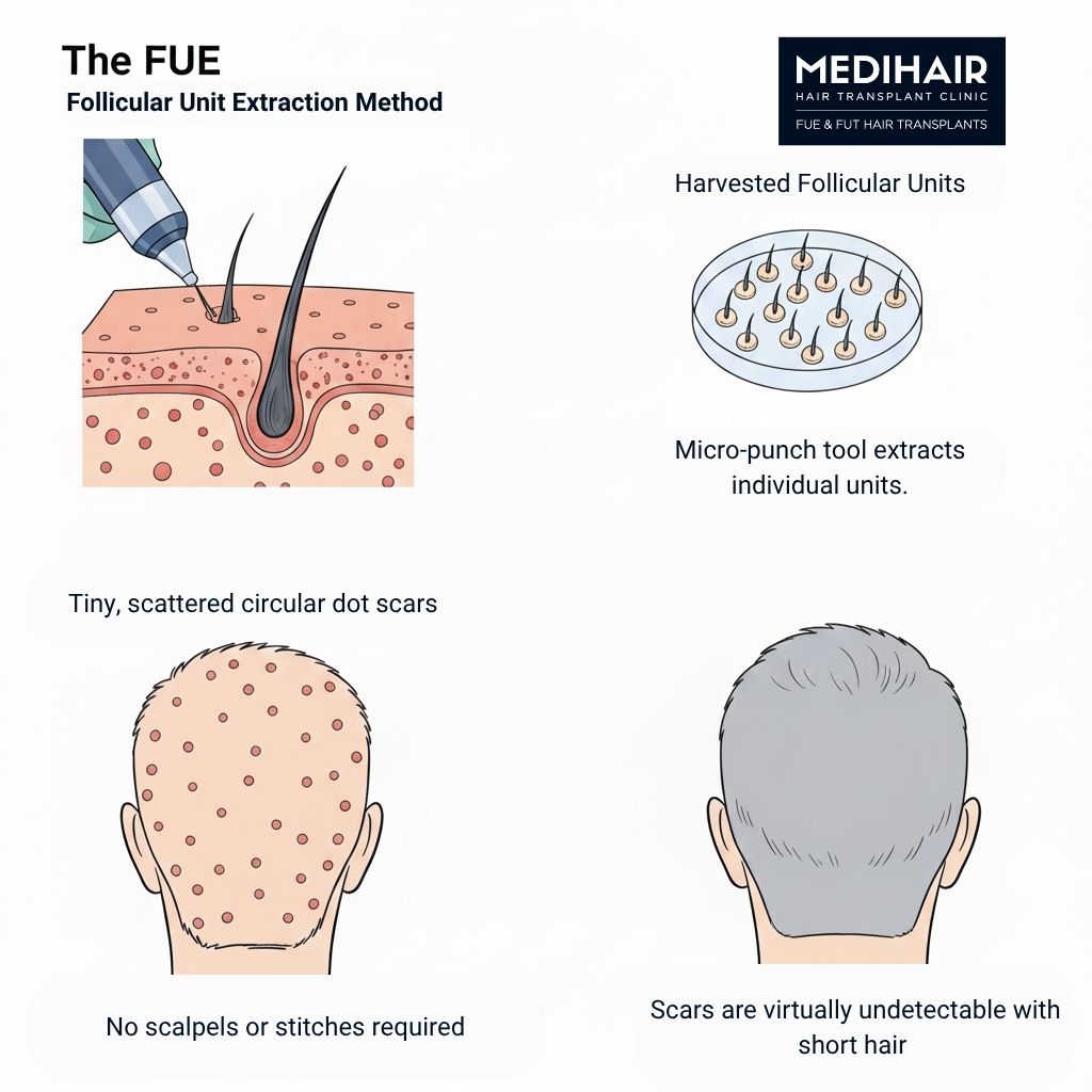 Follicular Unit Extraction (FUE) is a modern, minimally invasive hair transplant technique used to treat hair loss. It involves harvesting individual follicular units, natural groupings of 1-4 hairs, directly from the donor area using a specialised micro-punch tool.