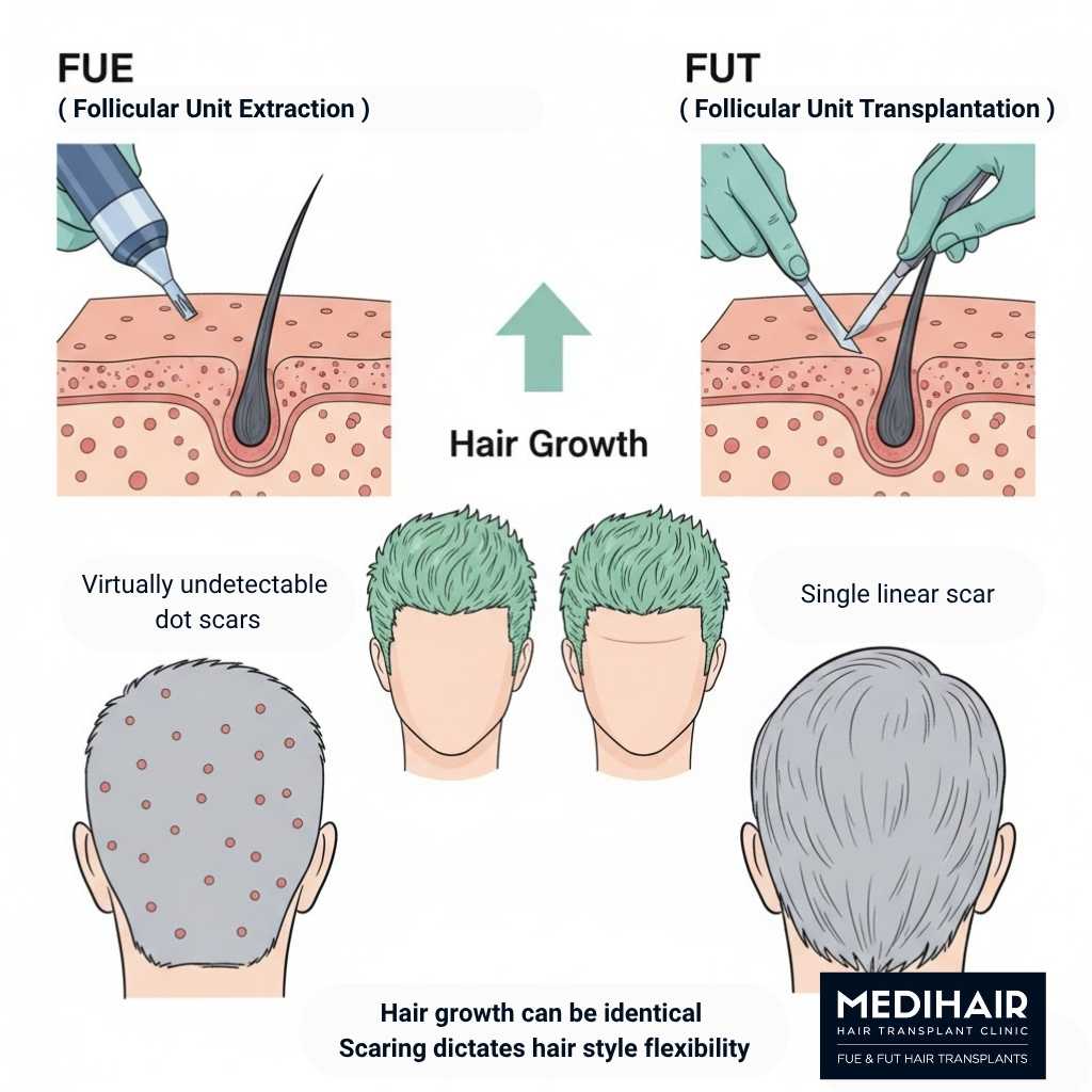 The primary difference between FUE and FUT is the graft harvesting method. FUE (Follicular Unit Extraction) extracts individual follicular units one by one from the donor area, leaving tiny, scattered dot scars that are virtually undetectable with most hairstyles. In contrast, FUT (Follicular Unit Transplantation) involves surgically removing a linear strip of scalp from the donor area, which results in a single, fine linear scar. While the final hair growth can be identical, the type of scarring fundamentally dictates your future hairstyle flexibility.