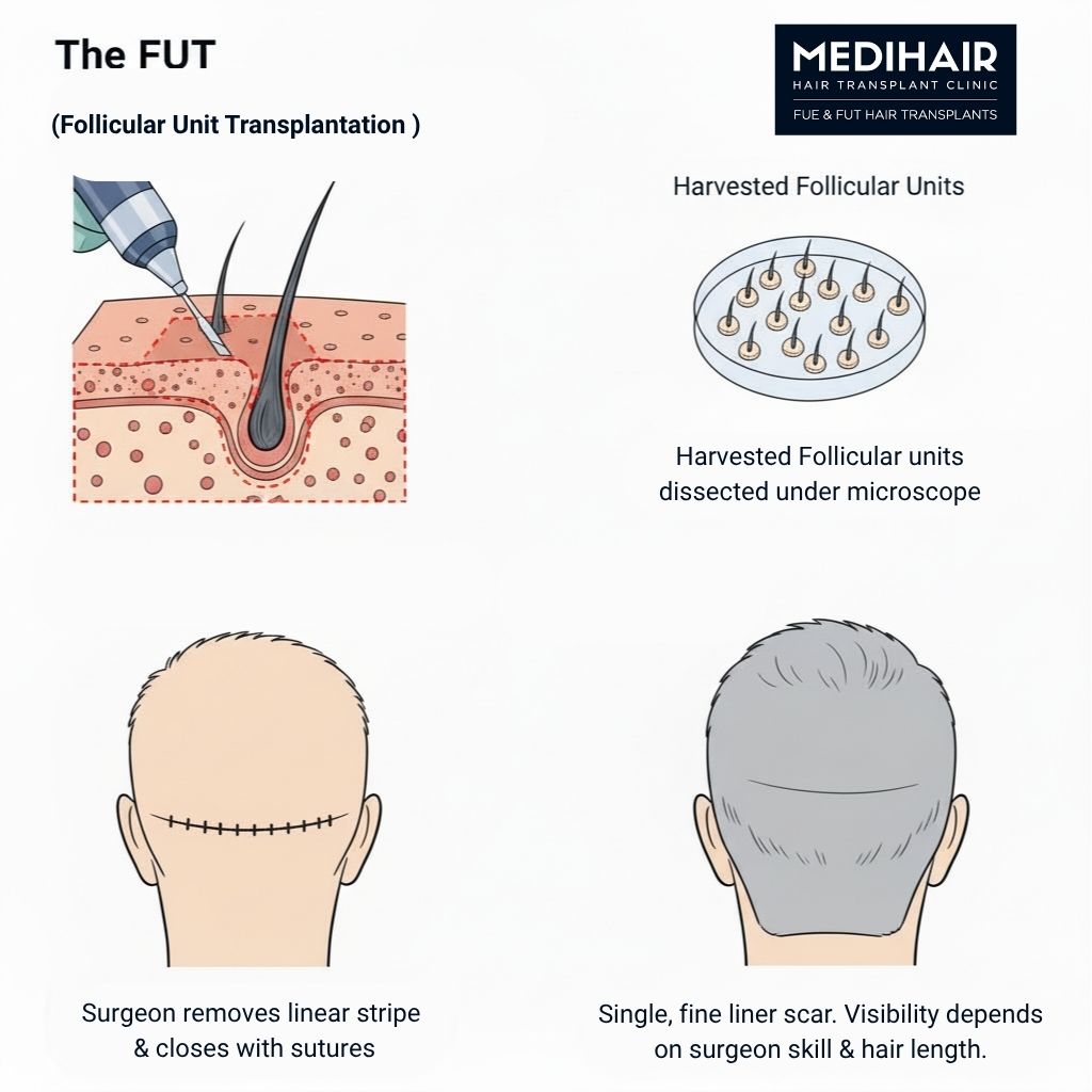 Often referred to as ‘strip surgery’, the FUT hair transplant is the more traditional method. It involves the surgical removal of a thin strip of hair-bearing skin from the donor area.
